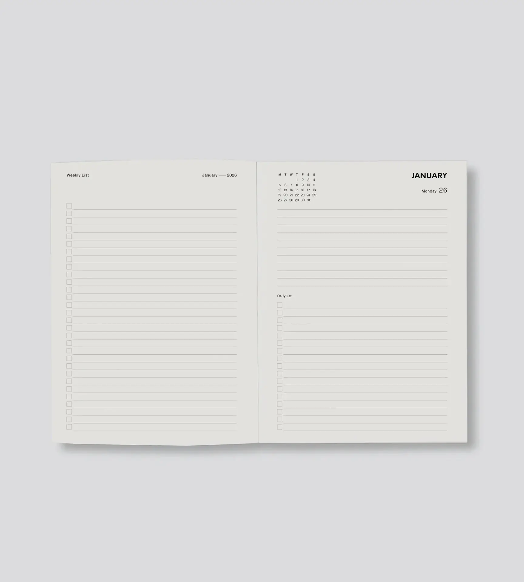 – Daily To-Do lists– Monthly double page planner– To do lists: Read, Watch, Buy, Listen, Do, Make– Lie flat cover– Ribbon marker
