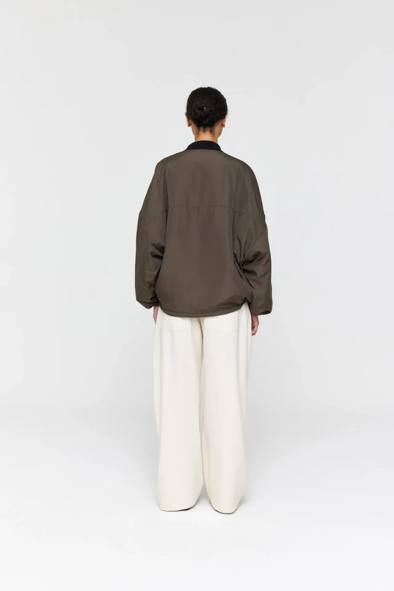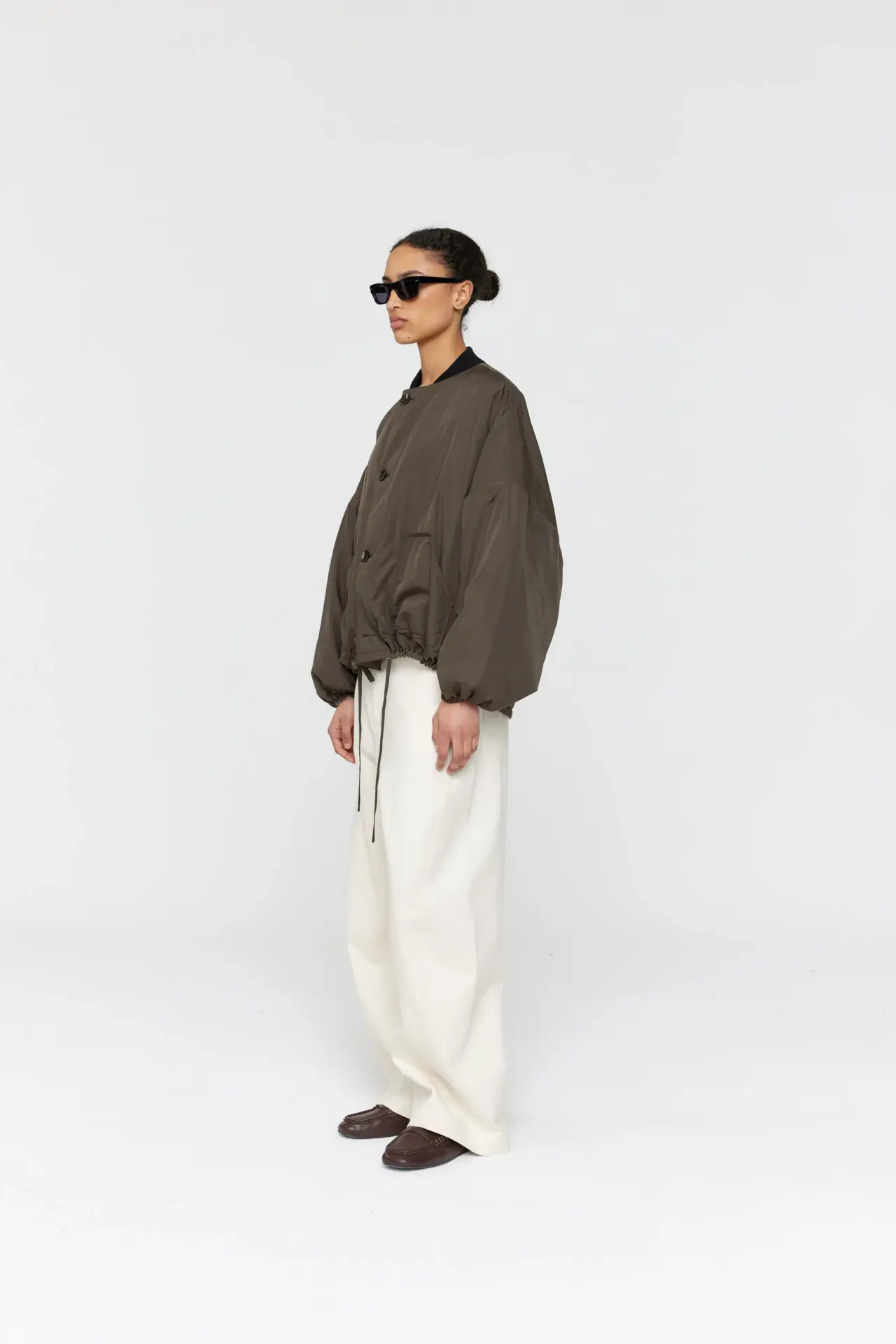 Stay warm and stylish with our Padded Forster Jacket. This quilted jacket is lightweight and features two large contrast patch pockets for convenience. The generous, dropped shoulder fit is complemented by contrast binding edges. Cropped length with fine drawstring ties on the waist. With its reversible design, the jacket is quilted on one side and lightly padded on the other. This jacket is perfect for any occasion.