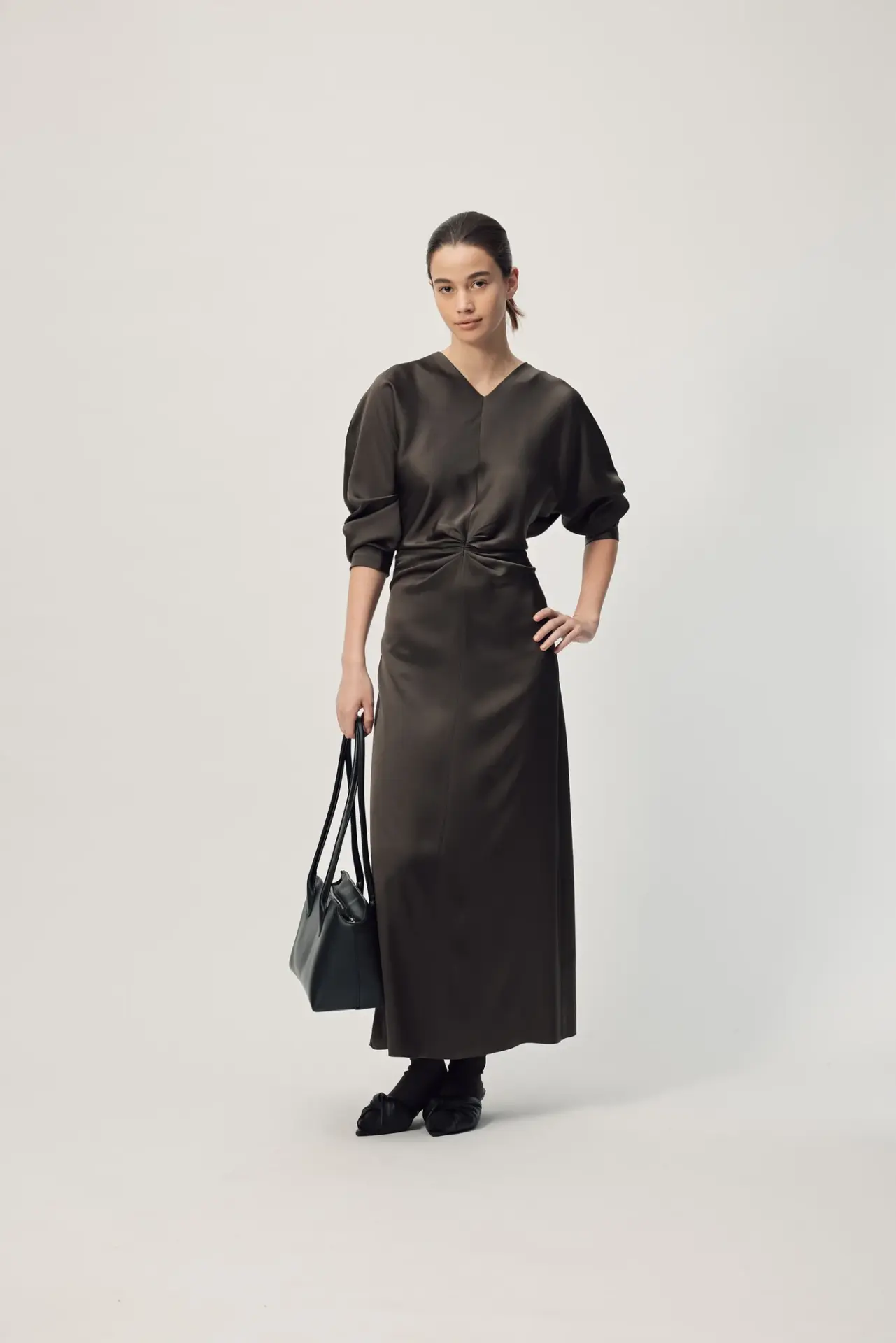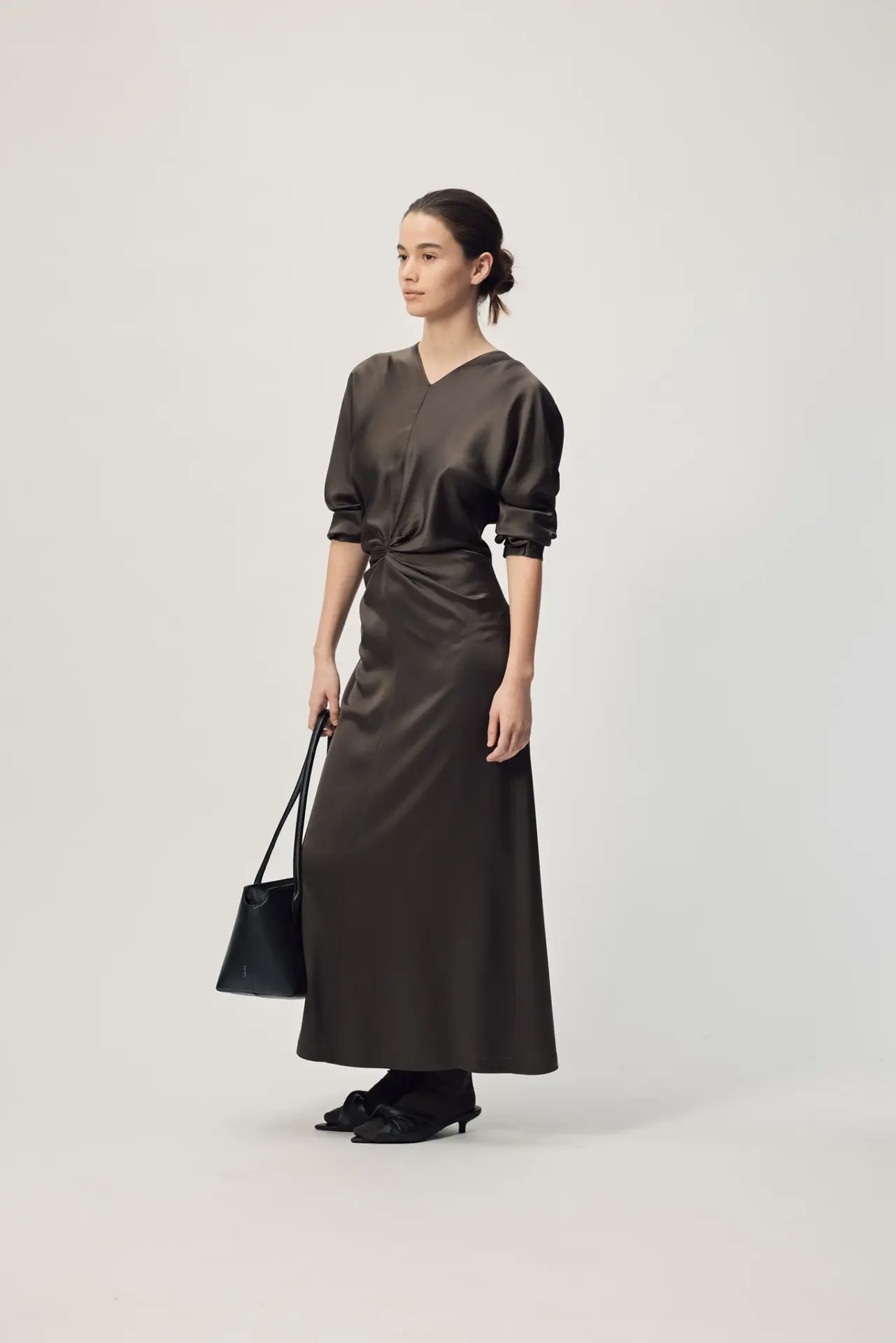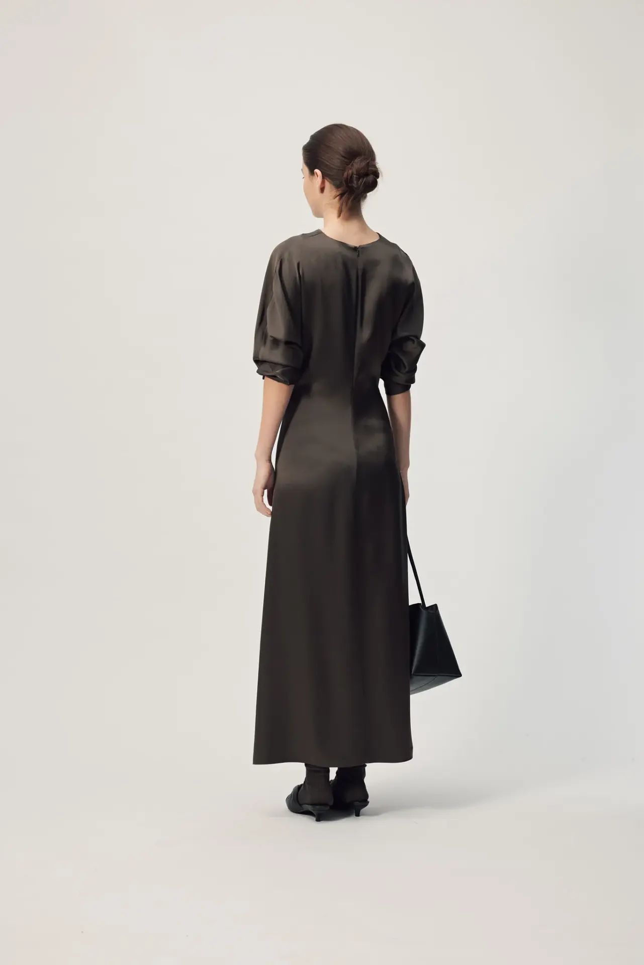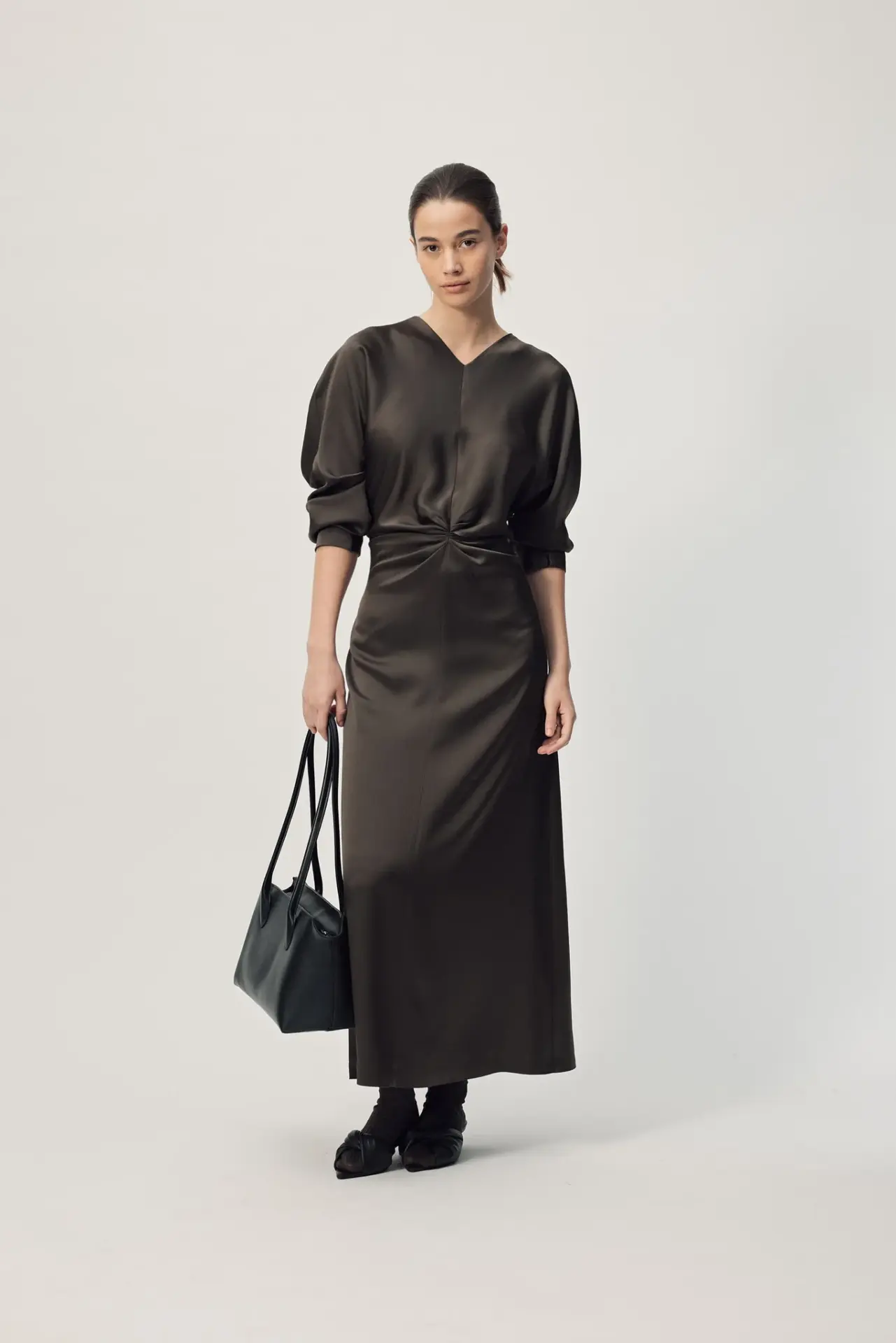 Experience understated elegance with the Long Sleeve Dorienne Dress in Sicilian Truffle. Crafted from luxurious Japanese satin, this refined piece combines timeless sophistication with thoughtful design details. The gathered waist creates a flattering silhouette, while the high V-neckline and tuck pleat detail add subtle visual interest. An invisible zip ensures a seamless finish, making this versatile dress equally at home at formal events or elevated everyday occasions.