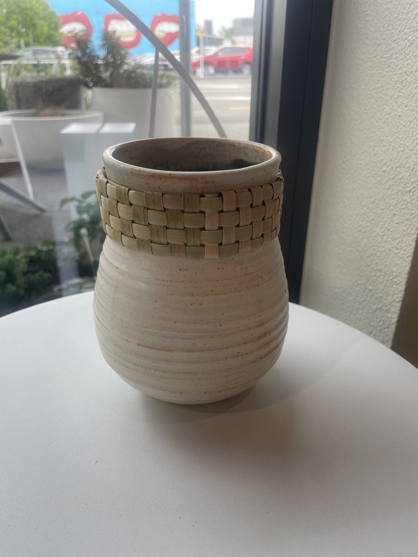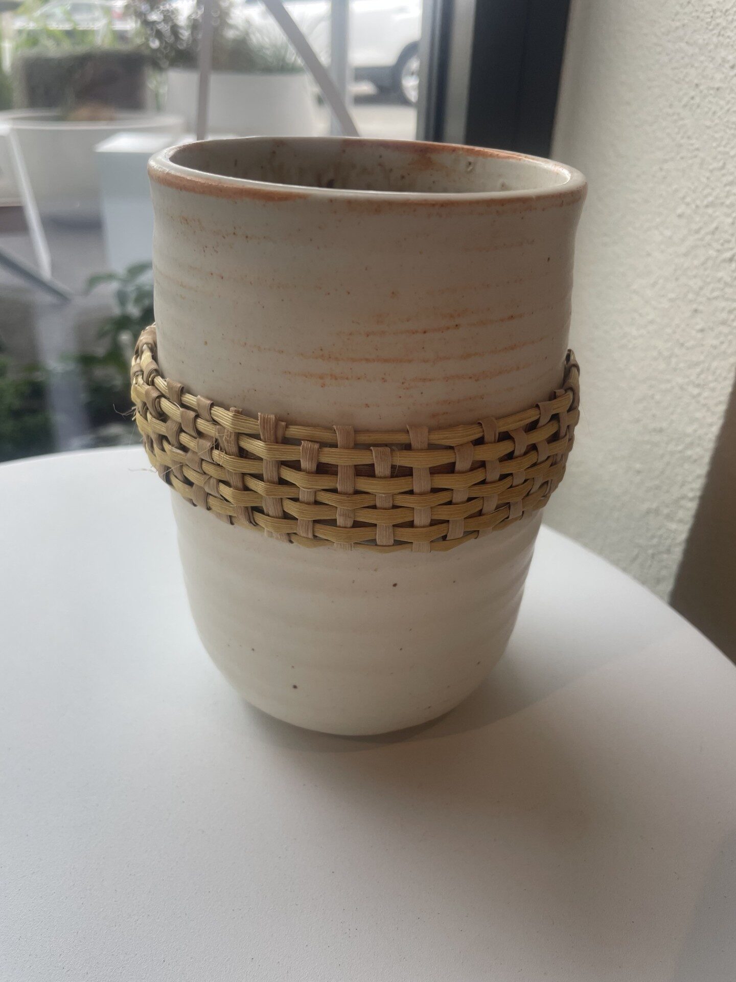 Beautiful natural ivory coloured glaze sets off the hand woven harakeke banding on these locally made mid sized vases. The interior shows some soft mark making in an appealing khaki sizeA vase this attractive deserves a place of admiration with ither with floral or foliage arrangements… there are 2 shapes to consider and choose from…