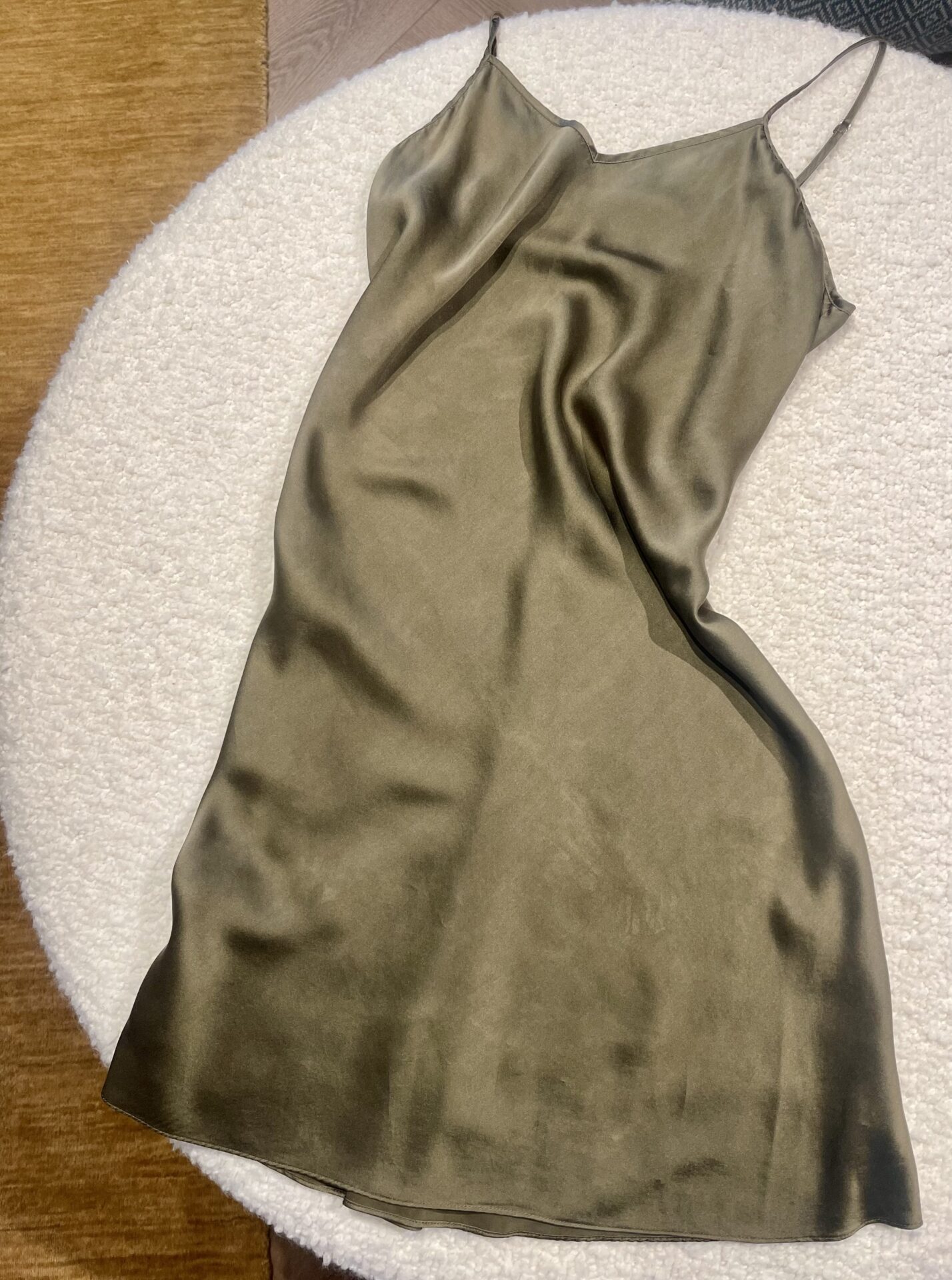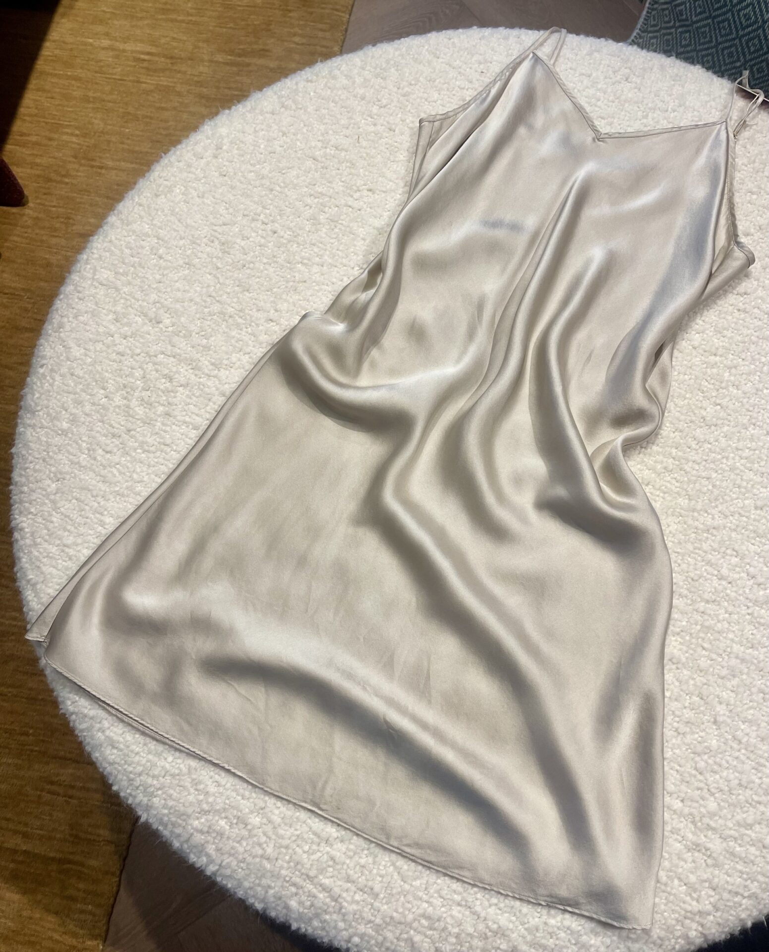 A one-of-a-kind naturally dyed silk chemise, dyed with madder root and printed with homegrown coreopsis and sulphur cosmos to give a truly unique floral terrain that shifts and changes in the light. Created from luxurious charmeuse silk, this piece is super soft on your skin and perfect for lounging or sleepwear.