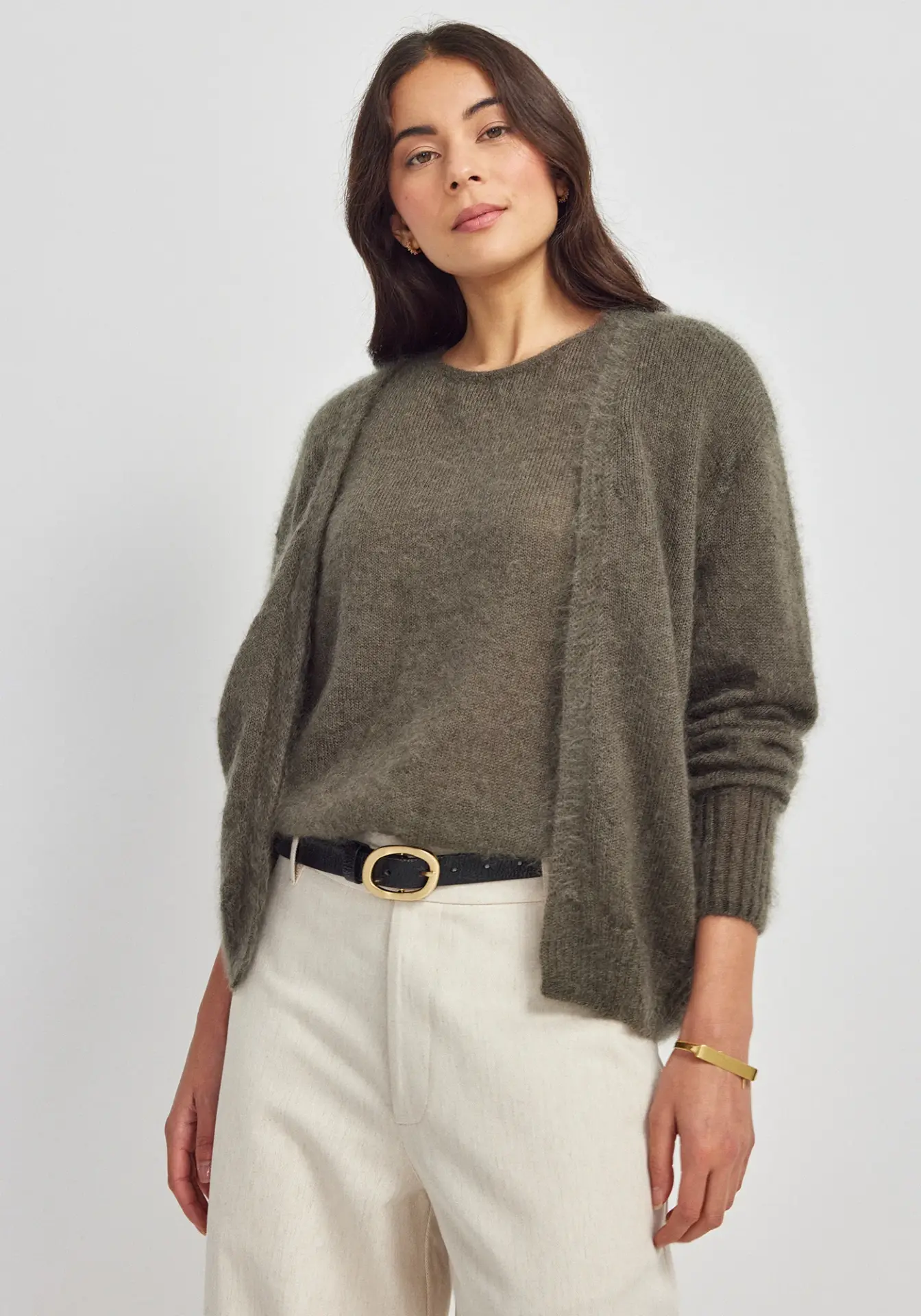 Wrap yourself in understated luxury with this effortlessly chic throw-on cardigan. The Super Kid Mohair and silk blend creates an impossibly soft, weightless layer that will feel like you’re wearing a cloud, without the bulk traditional cardigans often bring. This relaxed-fit piece is your solution to unpredictable temperatures, whether you’re navigating air-conditioned offices or breezy evening walks. Perfect for pairing with everything from fitted basics to flowing dresses.